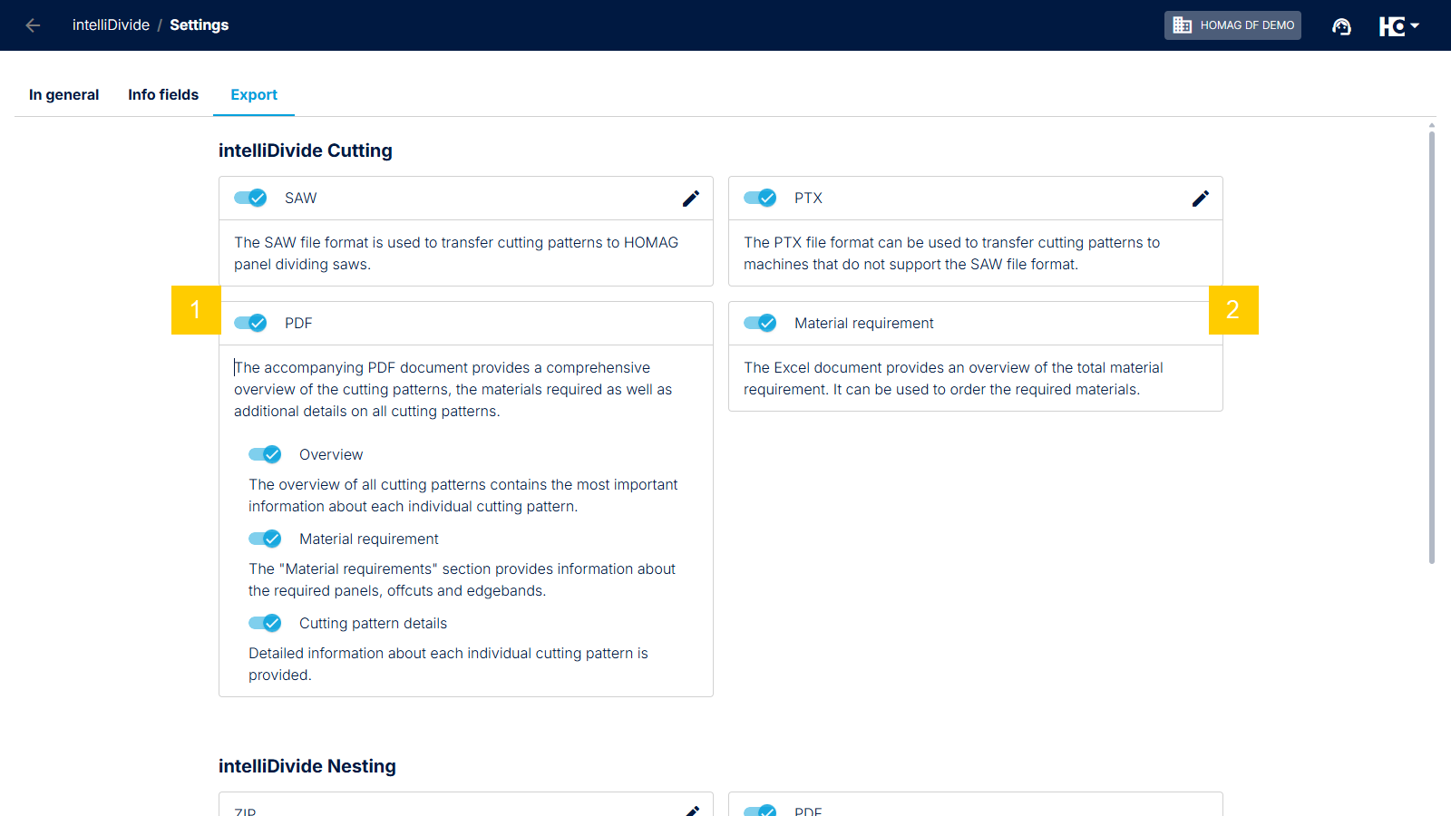 For intelliDivide Cutting, you can configure settings for the SAW, PDF, and PTX export formats.