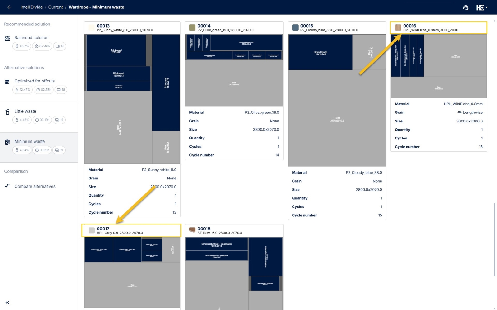 In intelliDivide, the cutting list is then displayed in addition to the parts list. Here you will find the laminates calculated for each carrier part, including their dimensions. Finally, the optimization can now be started