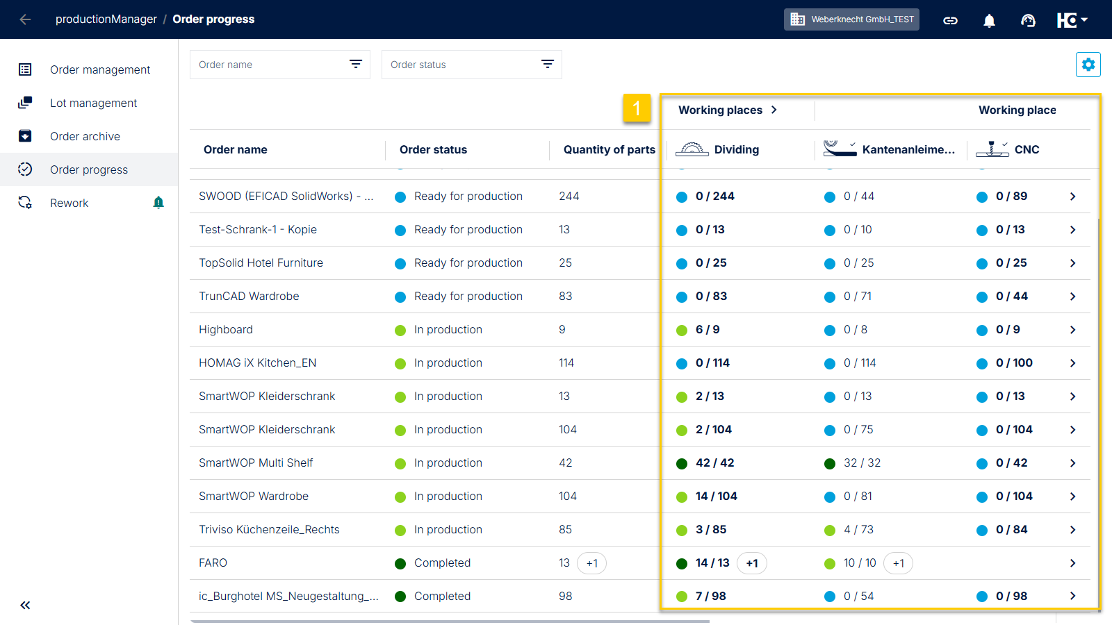 Even if you keep the productionManager tab open continuously, you will consistently receive up-to-date information about your order progress, enabling you to quickly react to changes in your production process.