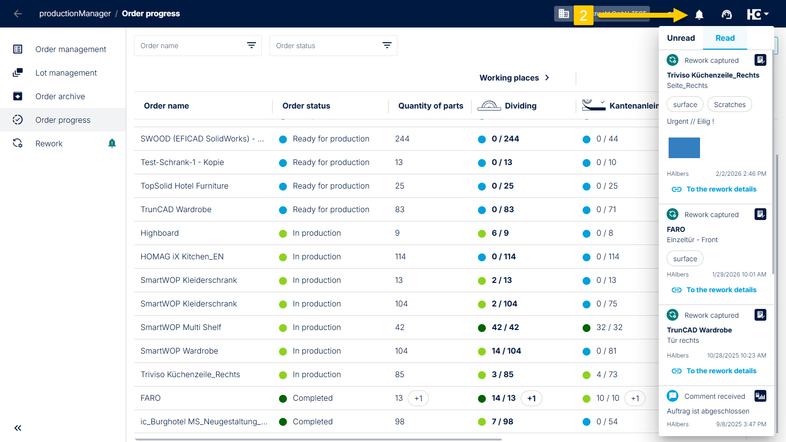 The "Order Progress" tab in productionManager and notifications about updates in productionAssist and productionManager are now automatically refreshed every 60 seconds. This allows you to always see the current status without having to manually reload the page.