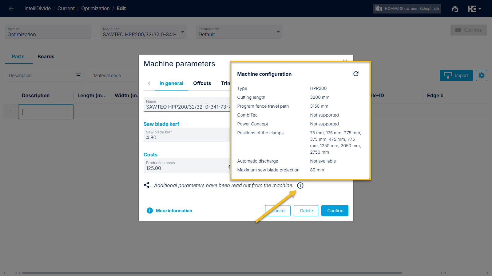 The automatically imported values are now displayed in the machine parameter dialog. This means you can check at any time which technical data intelliDivide is using for its calculations.