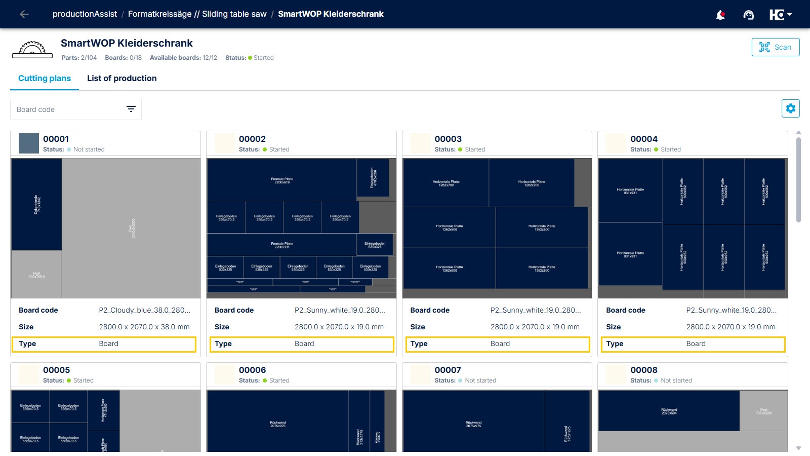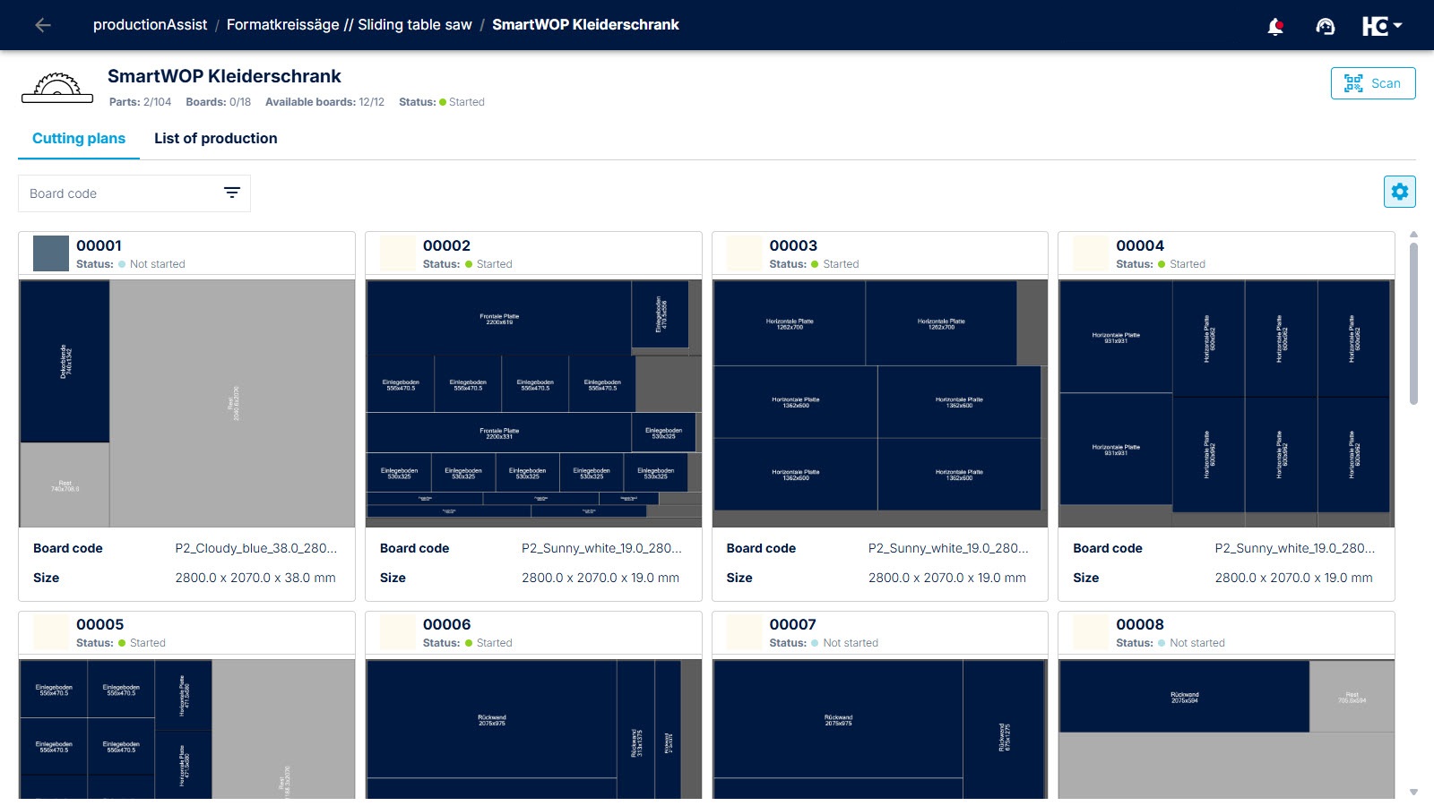 Clear presentation of cutting plans with additional information such as board code, panel size, and status.