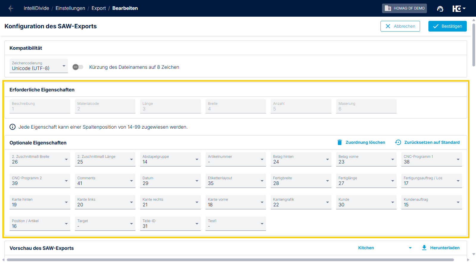 Die optionalen Eigenschaften weisen Sie analog zum SAW-Export einer Spaltenposition zwischen 14-99 zu.
