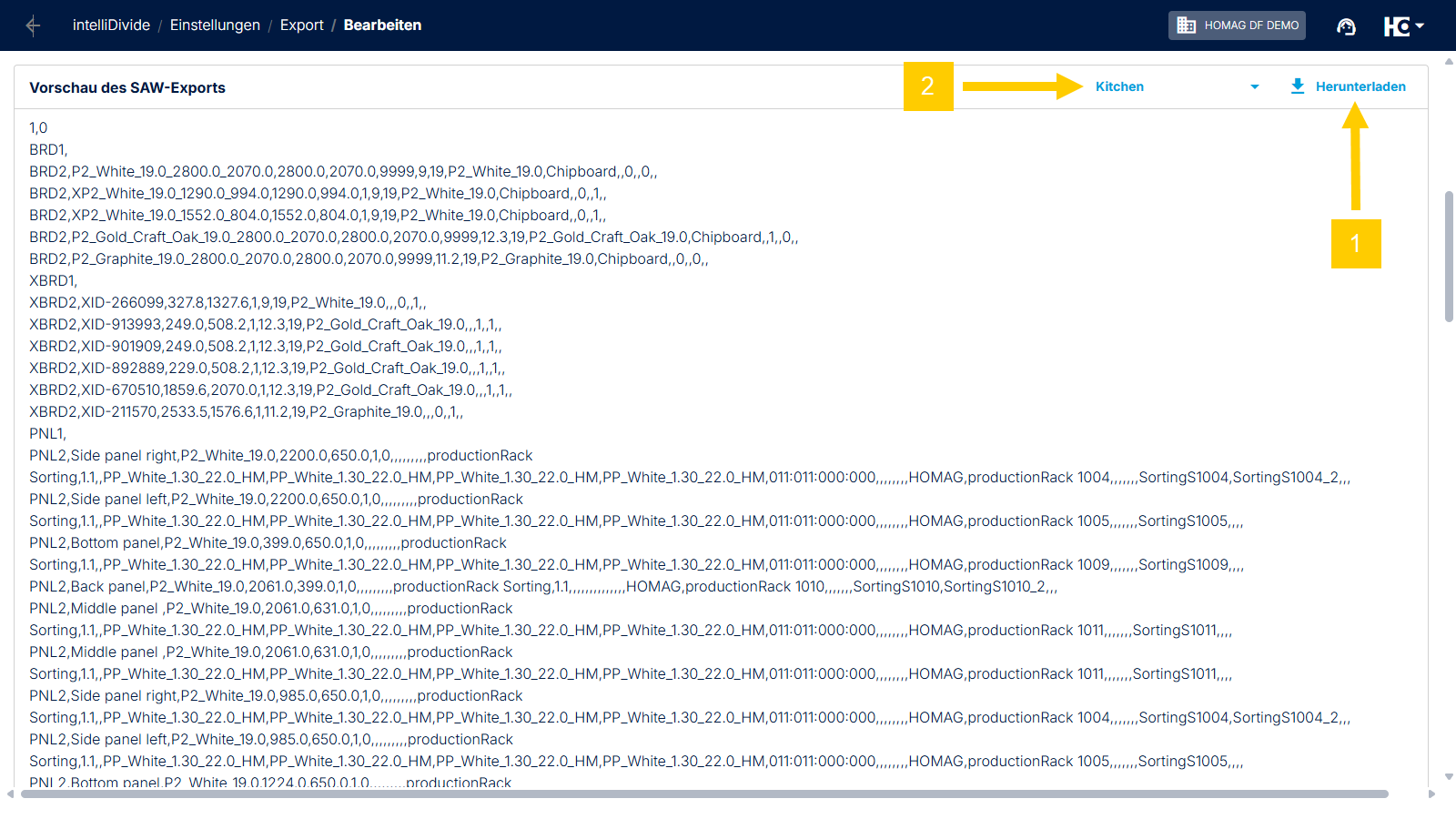Für intelliDivide Cutting stehen der Export Ihrer Optimierungsergebnisse in den Formaten SAW, PTX und PDF sowie separat der Export des Materialbedarfs zur Verfügung.