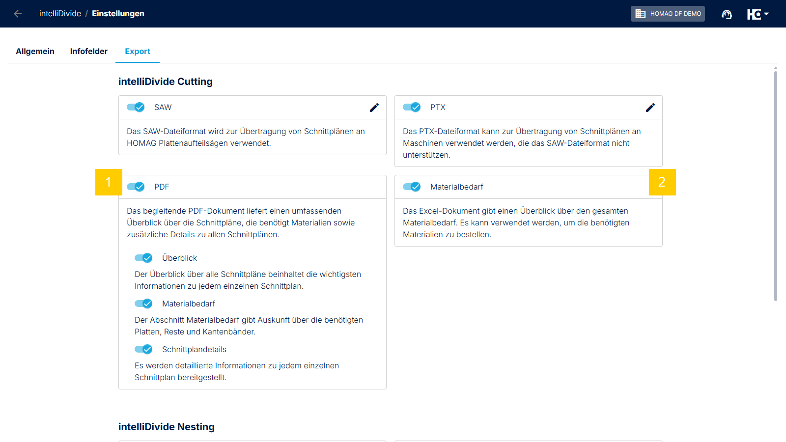 Für intelliDivide Cutting können Einstellungen zum SAW-, PDF- und PTX-Exportformat vorgenommen werden.