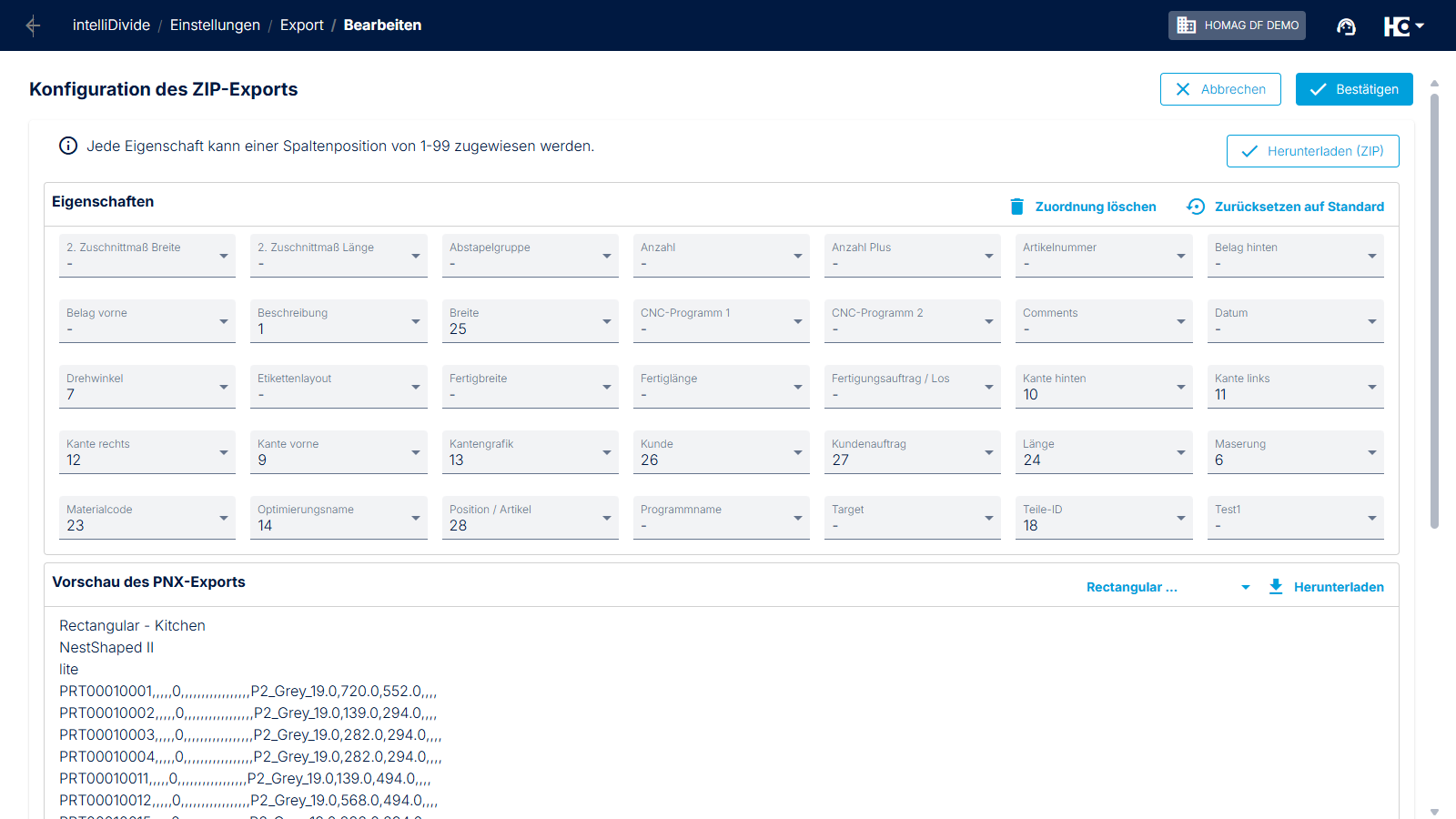 Auch für den PNX Export als Zip Datei weisen Sie jeder Eigenschaft eine Spaltenposition zwischen 14-99 zu.