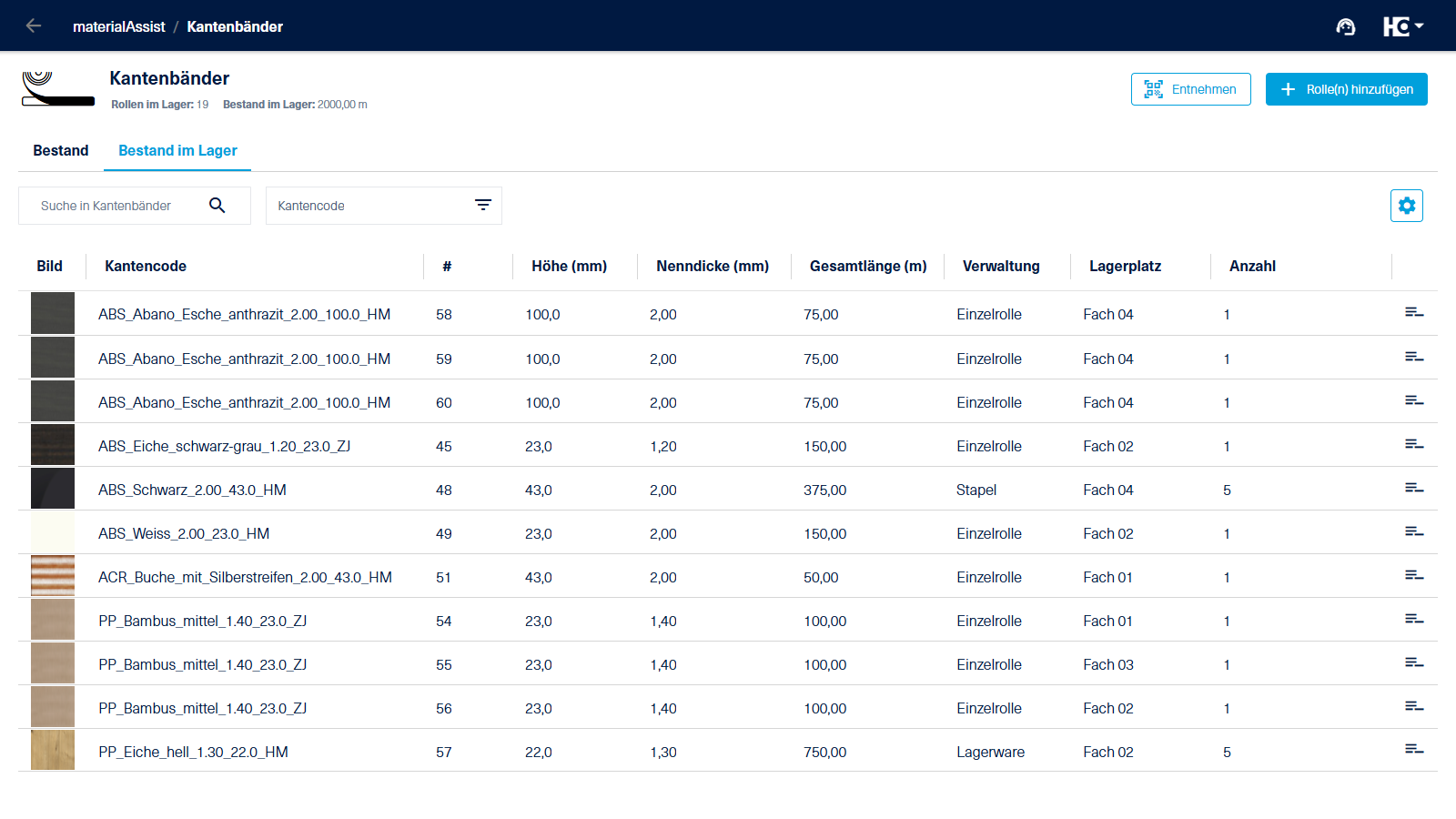 Die Ansicht "Bestand im Lager" (bzw. "Entnehmen" bei Platten) gibt Ihnen einen Überblick über die eingelagerten Materialien und deren wichtigsten Informationen. Die Materialien in dieser Liste stehen zur Entnahme zur Verfügung.