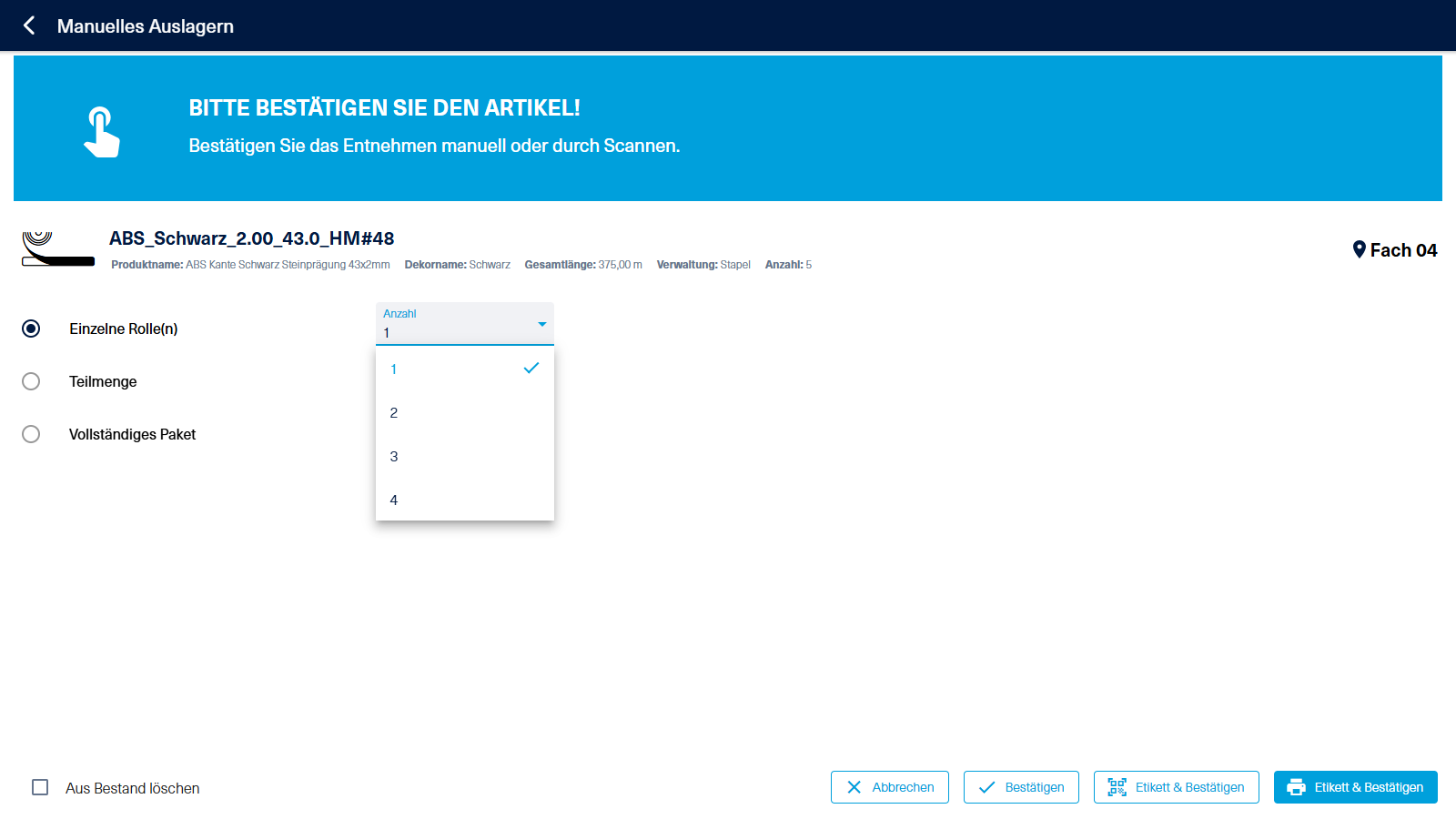 Sobald Sie ein Material entnommen haben, scannen Sie einfach dessen Etikett mit einem Bluetooth-Scanner. Daraufhin wird der Dialog "Manuelles Auslagern" geöffnet.