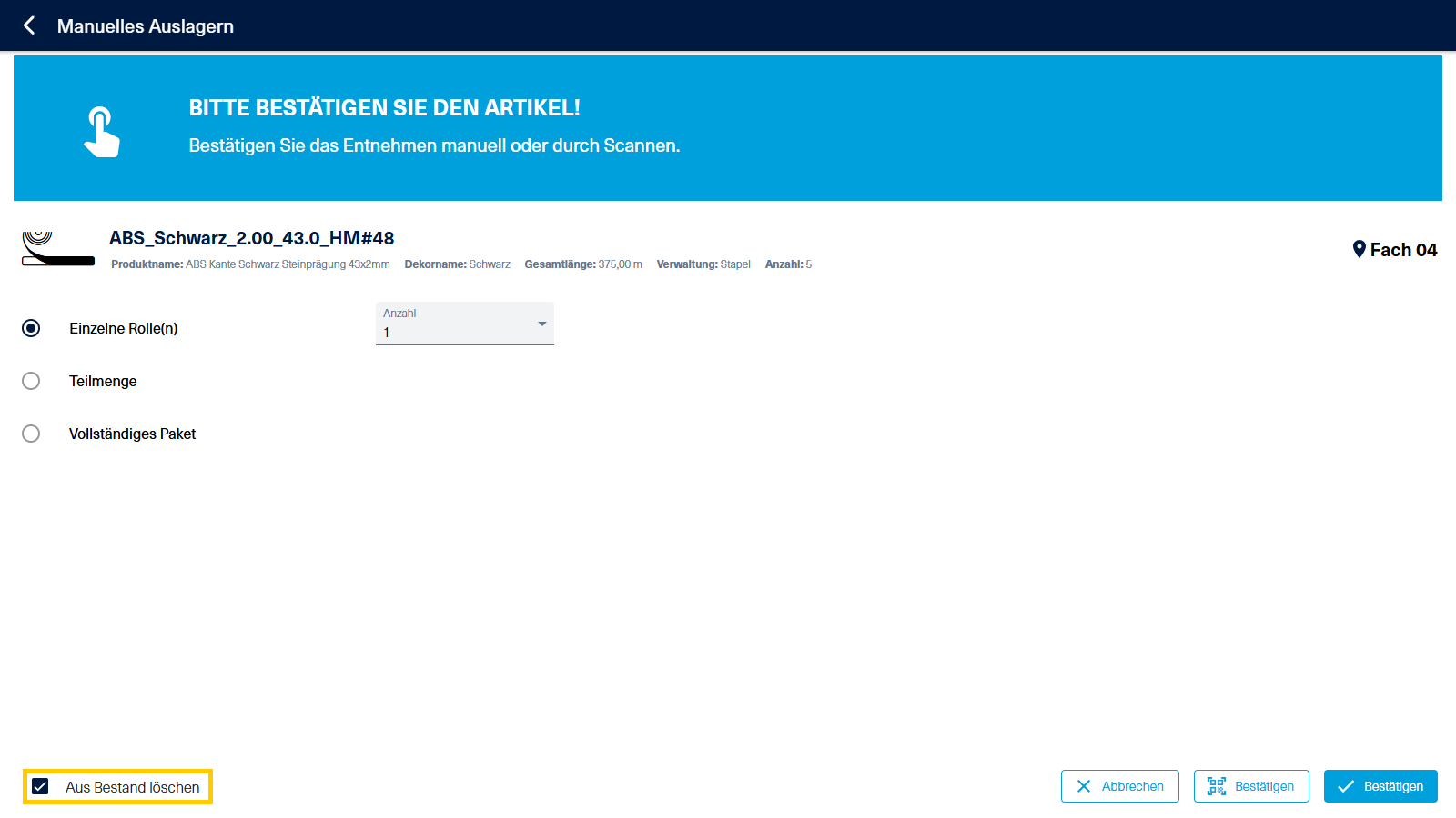 Bestätigen Sie die Entnahme durch einen Klick auf den Button "Bestätigen" oder indem Sie den Lagerplatz scannen.