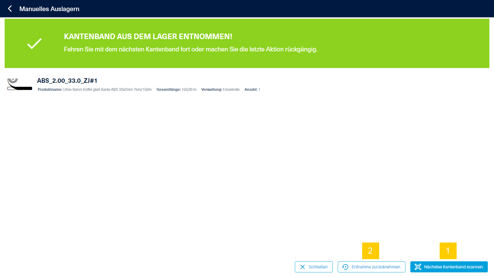 Durch Klick auf "Nächstes Kantenband scannen" (1) oder durch den Scan eines weiteren Materials, wird die vorherige Entnahme bestätigt und das nächste Kantenband entnommen.