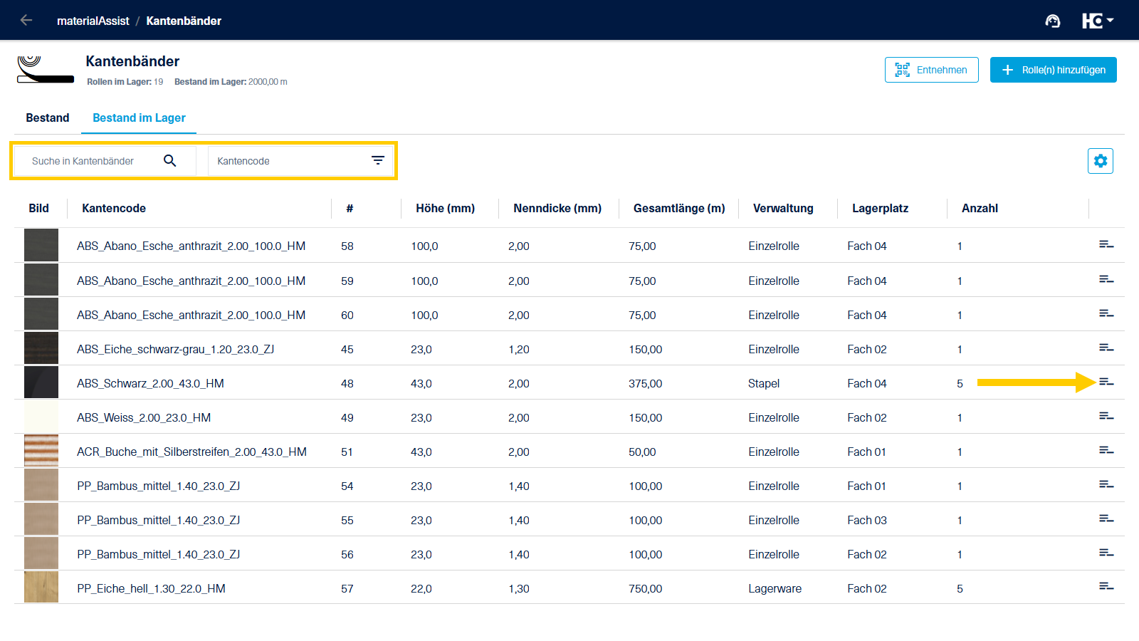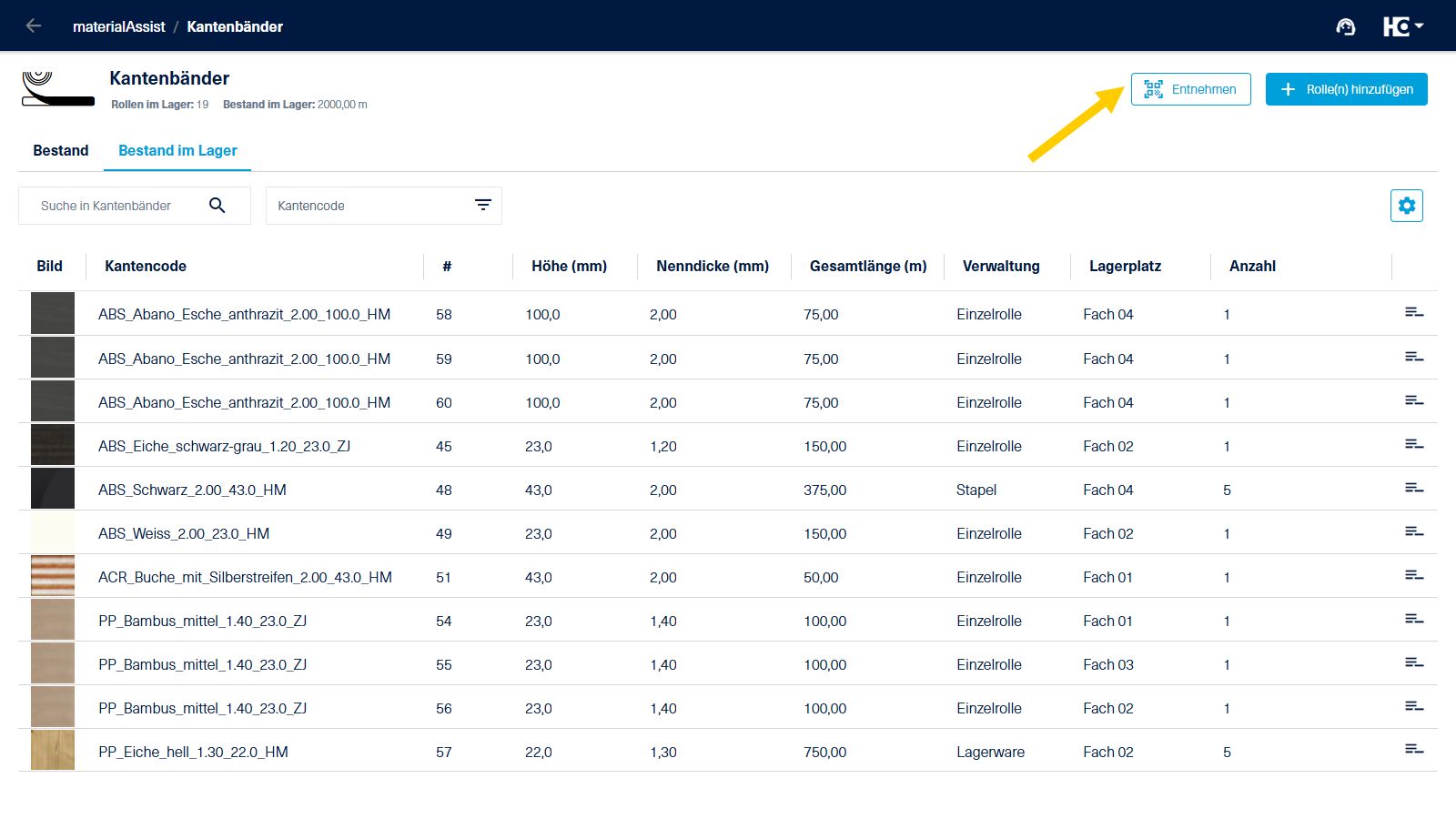 Auf dieser Seite zeigen wir Ihnen die Entnahme von Materialien am Beispiel einer Kantenbandrolle. Die Vorgehensweise für Platten ist dabei identisch.