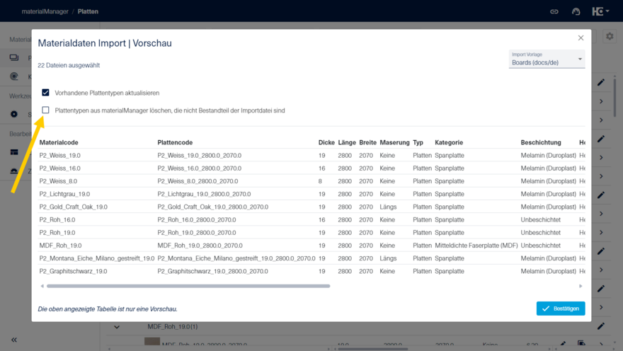 "Bestätigen" Sie anschließend im Dialogfenster des materialManager den Import.