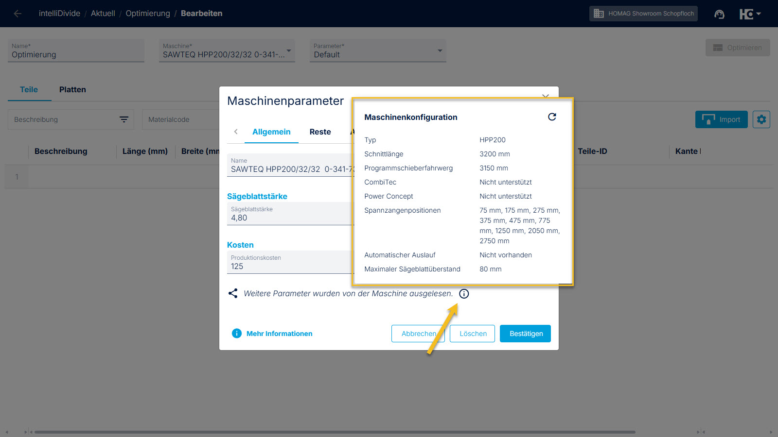 Im Maschinenparameter-Dialog werden die automatisch übernommenen Werte nun angezeigt. Sie können also jederzeit prüfen, mit welchen technischen Daten intelliDivide rechnet.