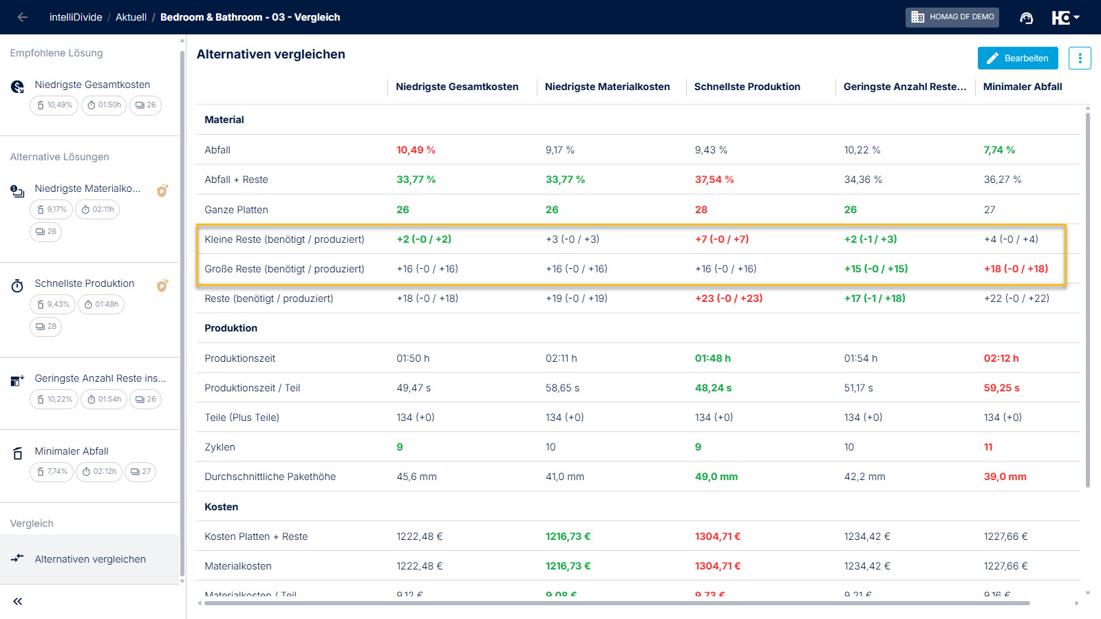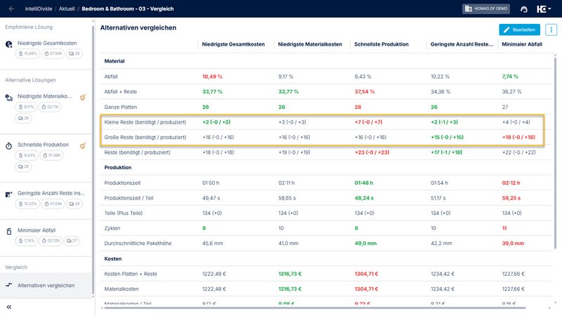 Zusätzlich können Sie nun in den Kennzahlen nach kleinen und großen Resten unterscheiden. Sind zwei Pläne ähnlich gut, erkennen Sie sofort, welche Art von Resten in Ihrer Produktion entstehen und auch welche verwendet werden.
