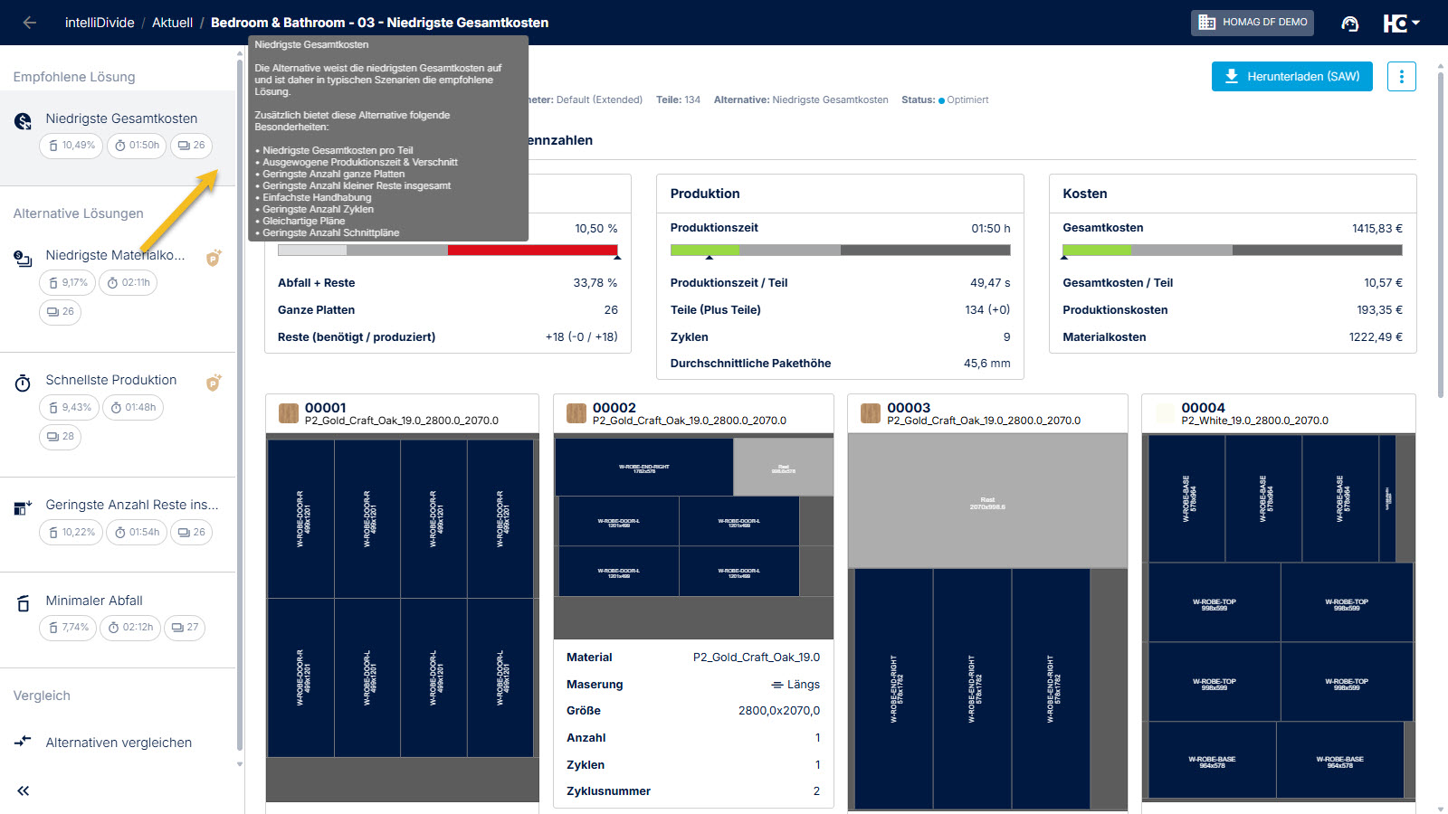 Wir haben die Benennung der Schnittplan‑Alternativen grundlegend überarbeitet. Dank klarer Namen, einer festen Sortierung und neuer Info‑Tooltips erkennen Sie jetzt auf einen Blick, warum intelliDivide Ihnen genau diesen Schnittplan empfiehlt.