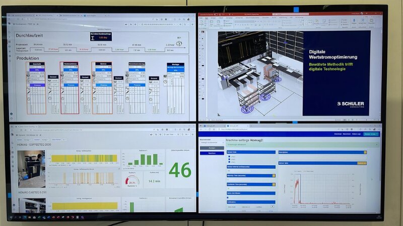 Bei der Digitalen Wertstromoptimierung fließen alle Daten in einem Dashboard zusammen. Die unterschiedlichen Screens zeigen die Zusammenhänge der Daten auf und ermöglichen, Optimierungsmaßnahmen ganz genau einzusetzen und ihre Wirksamkeit langfristig zu verfolgen.