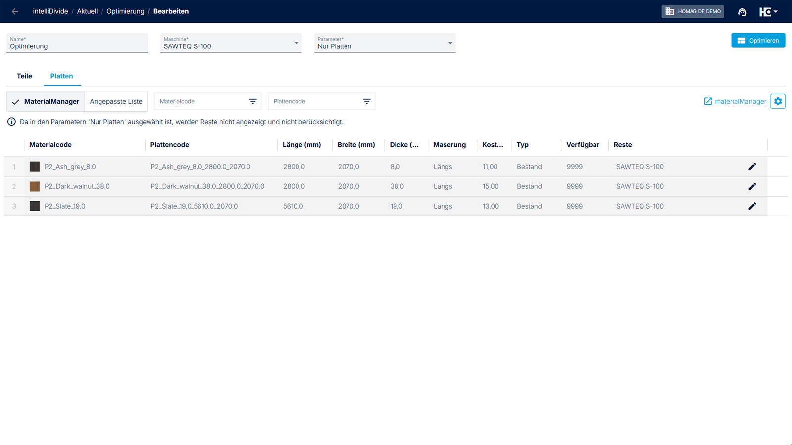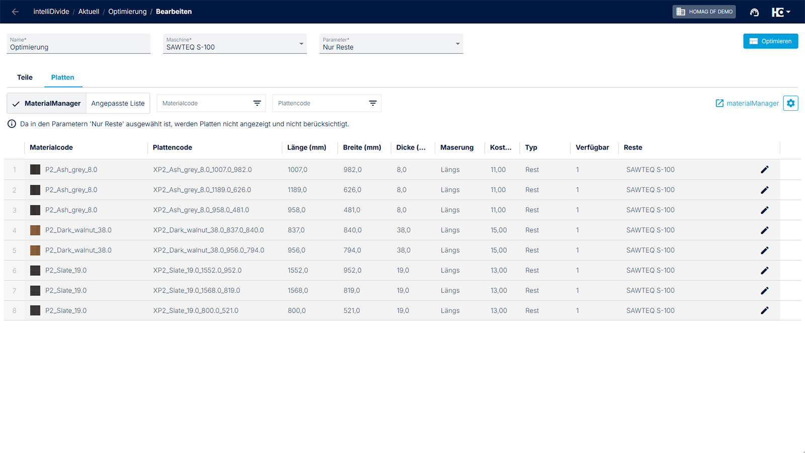 intelliDivide kombiniert Ihre Lagerbestände (Reste) und ganze Platten intelligent, dass so wenig Verschnitt wie möglich entsteht.