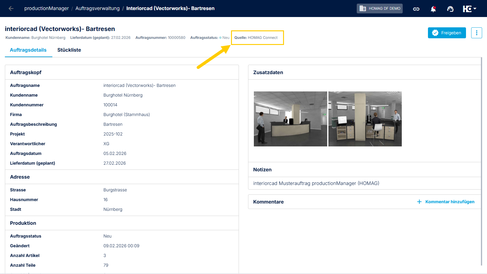 Die neue Eigenschaft „Quelle" wird auf Auftragsebene in den Apps productionManager und productionAssist angezeigt.